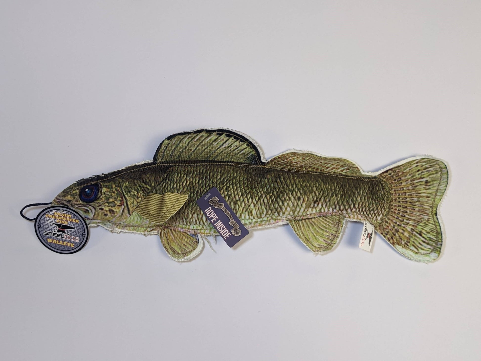 With a realistic print and durable body with rope inside, this Denim Walleye will be your dog’s second favorite fishing buddy. Inside includes a squeaker, but no stuffing for less of a mess. Denim Fish have a Tough Chew-o-Meter rating. Even if they do make it through the seams, another toy is ready to play!
