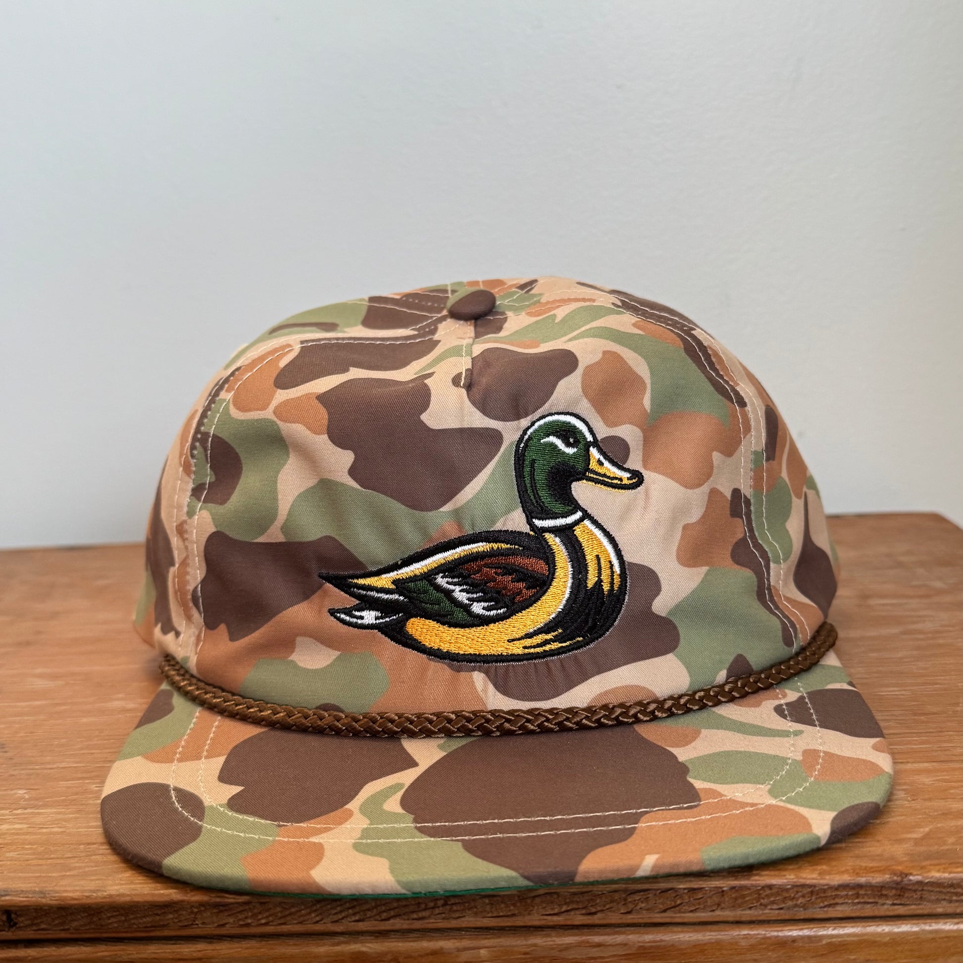 Get ready to look quackingly stylish with our Mallard Camo Hat! This hat features UPF protection, leather adjustable strap and an embroidered patch of everyone's favorite duck. The rope detail adds a touch of rustic charm. Don't be afraid to let your inner mallard shine!