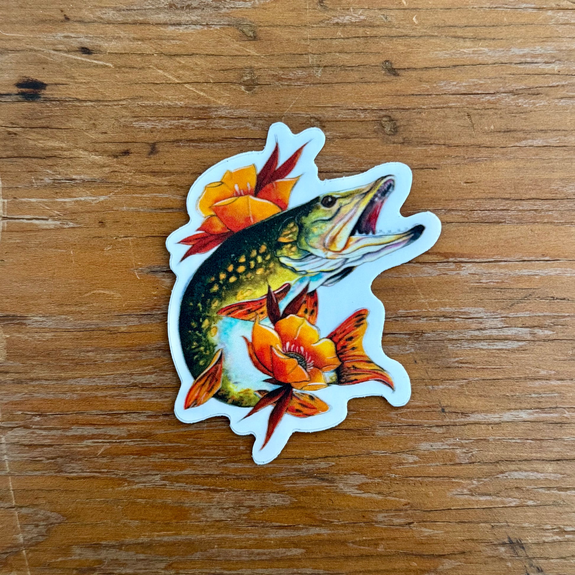 Hook, line, and sticker! This vinyl sticker showcases a neotraditional tattoo style of a northern pike for all the fishing enthusiasts out there. A perfect addition to any tackle box or water bottle. Reel it in and add some character to your gear!